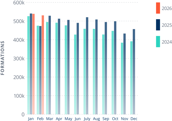 More importantly, the year-over-year data tells a different story: formations are up 12% compared to February of 2025, reflecting resilient underlying growth that short-term fluctuations can’t hide.