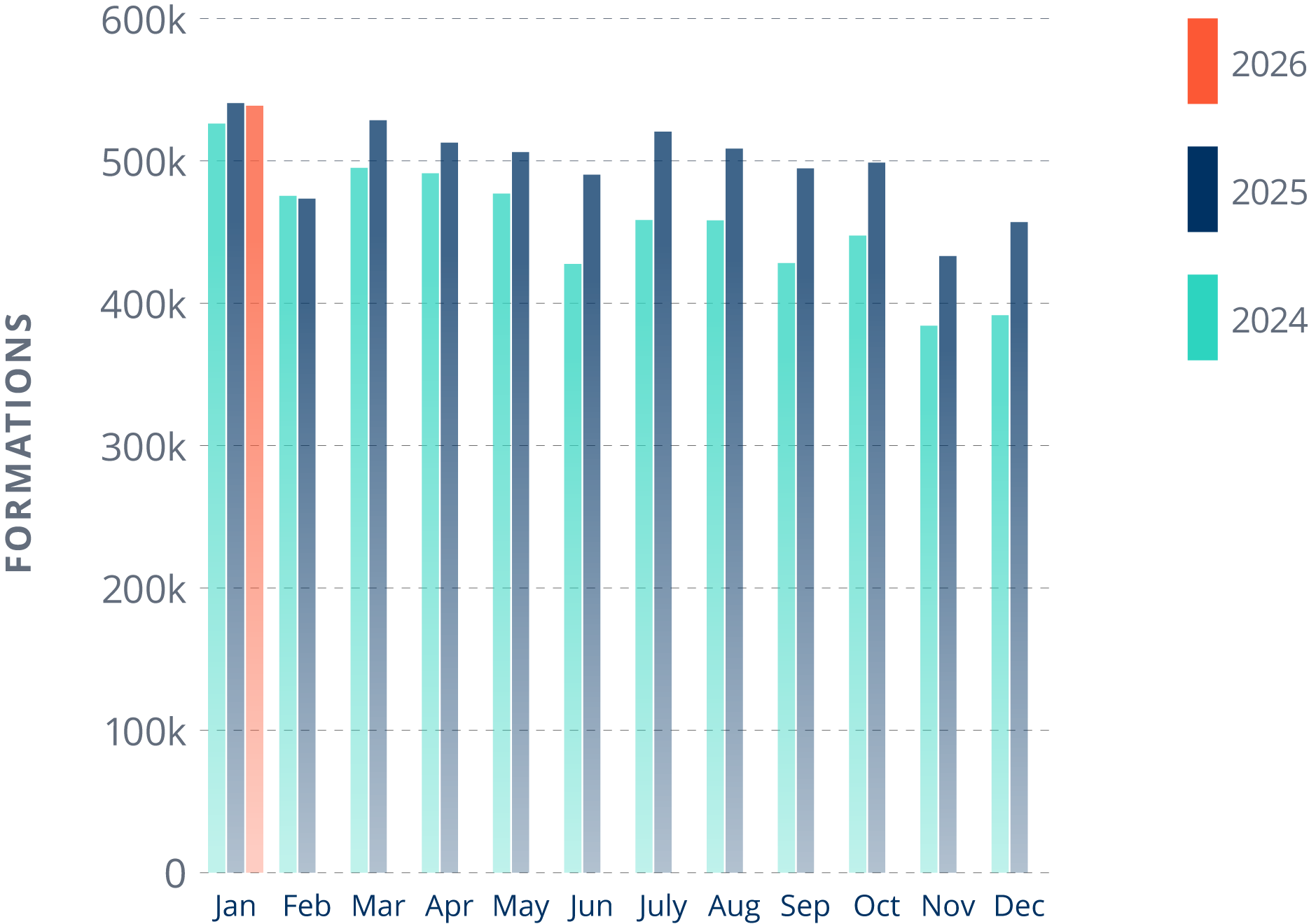 January formation numbers already point toward another strong year. So far, new business counts are doing two things at once: staying level with January 2025 while also outperforming last month by a respectable 18%.