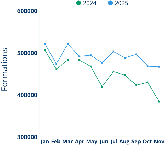 Unlike the US Census Bureau Business Statistics report, we do not differentiate between business entities that go on to hire employees and file payroll taxes. We count every entity formed, so our numbers include holding companies, single-member LLCs, and non-employer businesses.